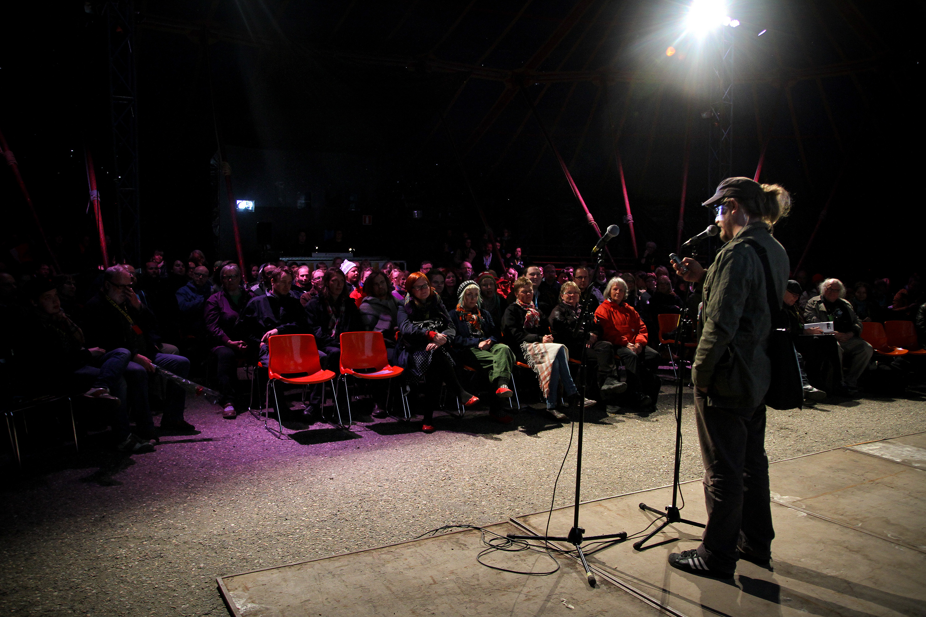 Eero Tammi lukemassa Rax Rinnekankaan tekstariterveisiä Romanssin yleisölle